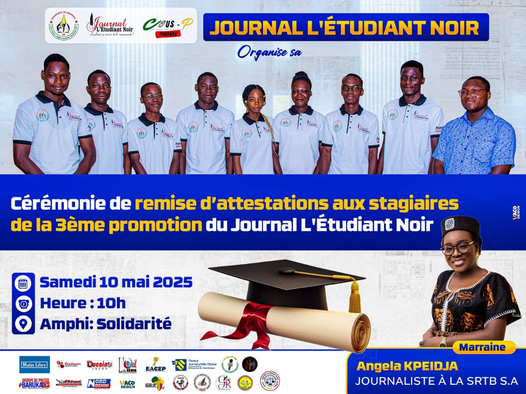 #Actualités REMISE D’ATTESTATIONS AU JOURNAL L’ÉTUDIANT NOIR: Angela Kpeidja marraine de la 3ème promotion. -NordBenin Fidèle à son calendrier d’activités, le Journal L’Étudiant Noir (JEN) de l’Université de Parakou (UP) organise une cérémonie de remise Comment (0) (745)