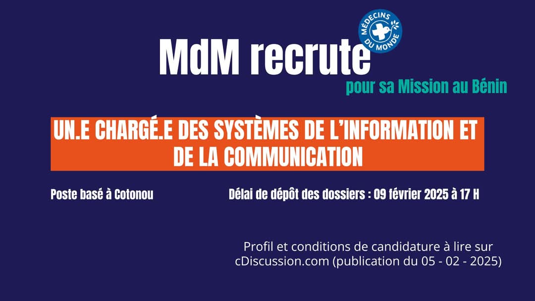 #Actualités AVIS DE RECRUTEMENT: Médecins du Monde Suisse au Bénin recherche ce profil. -NordBenin Médecins du Monde Suisse au Bénin recherche un.e Chargé.e des Systèmes d’Information et de la Communication (CSIC) pour son bureau Comment (0) (904)
